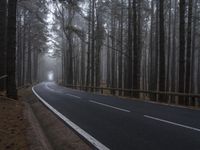 A gloomy and foggy morning in rural Tenerife, Spain. The wet asphalt road cuts through a dense forest, creating a mysterious and emotional atmosphere. The grey sky adds to the overall sense of gloom.