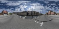 the image of a street and a sky from a fisheye lens with buildings on both sides