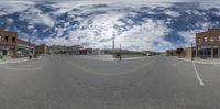 A straight road in rural Utah, lined with classic architecture storefronts. Shadows cast by the clouds and mountains create a hard shadow effect. One quarter down the road, a hotel, cinema, museum, and restaurants offer urban amenities in a small town setting.