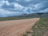 Off-road track in rural Utah, with one quarter of the landscape covered in sand and gravel. Clouds engulf the clear blue sky on a sunny day. A serene and natural setting in the USA.