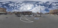 a fish eye view of the outside area in a town center as cars are parked along the side