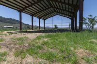 This image captures a rustic rural scene in Crested Butte, Colorado, USA. It features a barn, surrounded by a grass surface and mountains in the background. The barn provides shade for the animals, standing peacefully inside. The clear sky overhead adds to the picturesque landscape. The area showcases the connection between agriculture and real estate in this part of Colorado. The grass and dirt surface is complemented by the gravel and hay surrounding the barn. This photo encapsulates a typical day in rural USA.