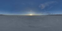 An endless landscape of salt flats under a sunny skydome. The sun is visible in the clear day, casting a bright light over the salt lake and desert surroundings.
