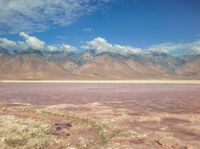 a dry lake with mud on it surrounded by mountains in the distance there is pink salt floating off the ground