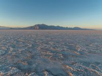 Utah's Salt Lake City landscape at dawn. A clear sky above the salt lake, with mountains in the background. Night transitions into the break of day, highlighting the dark desert nature of the area.