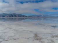 A landscape in Salt Lake City, USA showcasing open spaces and mountains in the desert. The sun shines brightly with clear skies above, highlighting the salt-covered ground. A perfect sunny day in Utah.