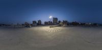 Aerial view of Salt Lake City at night, showcasing its modern architecture and cityscape. Concrete streets and office buildings contrast with the clear night sky. Skateboarder prepares for an aerial trick in the elevated park.