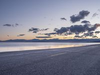 This image captures the dramatic landscape of Utah, USA. At dawn, as the sun rises, a road stretches across the open space towards the coastal water. The asphalt road leads to the desert and mountains in the distance, creating a striking contrast against the blue ocean and sea. The shore of the lake can be seen on the horizon. The clouds in the sky add to the dramatic atmosphere of the scene. This photograph showcases the natural beauty and diverse environment of Utah, with Salt Lake City and the famous Bonneville Speedway nearby.