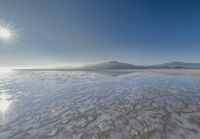 A serene landscape in Salt Lake City, Utah, under a clear sky with the sun visible. The open space showcases the majestic mountains and salt formations of the desert. Pure sunshine bathes the nature-packed shot.