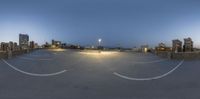 a night time image of a parking lot at dusk with the lights on in the distance