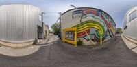In Salt Lake City, Utah, three large cylindrical buildings covered in vibrant graffiti stand out against a clear sky. The art district's concrete streets are a canvas for street art. Daytime and evening views capture the hard shadows cast by the buildings.