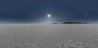 Utah's Salt Lake City at dawn, showcasing a vast salt surface landscape under a clear sky. The sun visible during the break of day creates a sunny and serene atmosphere in the desert.