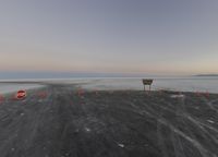 a small stop sign stands on the beach at sunset near road cones on a sand surface