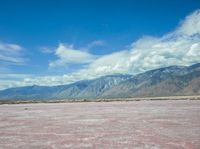 the pink color is the salt in the desert with hills and clouds above it and the sky has fluffy white wispy clouds