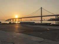A stunning view of San Francisco at dawn, with the sun visible on the horizon. The city's iconic suspension bridge and a nearby river create a beautiful coastal landscape. Residential areas and industrial factories blend into the urban design.