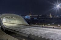 an empty highway going into a tunnel at night with lights on and on a building in the background