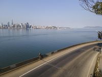 A stunning view of the San Francisco skyline at dawn, with modern skyscrapers towering over the city. The cityscape is reflected in the calm waters of the ocean, creating a picturesque scene. The clear sky and coastal location add to the urban design of this metropolitan area.