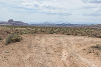 a motorcycle is driving through the desert on an empty road in a mountainous landscape with a sky