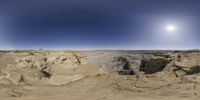 a desert area with sand and rocks near the sun and the sky is clear with a lens