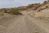 A scenic view of the San Rafael Swell in Utah, USA. The red rock landscape contrasts with the grey sky. A dirt road winds through the desert, surrounded by mountains and vegetation.