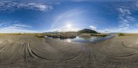A panoramic view of a sandy beach surrounded by mountains. A river flows through the landscape, creating a lush and natural environment. The fisheye lens captures the beauty of this rural wilderness.