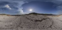 Sandy beach with a view of the ocean and a sand dune, captured through a fisheye lens. The azure sky reflects on the water's surface, creating a serene coastal landscape on a sunny afternoon.