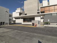 Modern architecture in the heart of Santa Monica, California. This building stands out in the city's business district, with a sleek facade of concrete and large windows. The surrounding asphalt parking lot is bustling with city life.