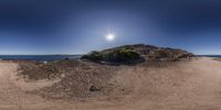 Long Point, a secluded beach on the Sapphire Coast of New South Wales, Australia. The elevated headland offers panoramic views of the azure ocean. The lone beach is surrounded by bedrock formations and cliffs, creating a picturesque coastal landscape.