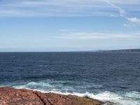 A breathtaking view of the Sapphire Coast in New South Wales, Australia. From a high point near the shore, waves crash against rocks creating a stunning display. The azure ocean stretches out to the horizon, while clear skies and fluffy clouds add to the idyllic coastal landscape.