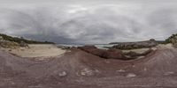 A rugged and grey shoreline along the Sapphire Coast in New South Wales, Australia. Open space with rocky cliffs and outcrops create a gloomy yet captivating landscape. A person gazes upon the distorted lens image of the beach.