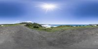 A skateboard ramp overlooking the sparkling waters of the Sapphire Coast in New South Wales, Australia. The bright sun shines on the blue sky, creating a stunning coastal landscape. Cuttagee Point and Bermagui provide the perfect backdrop for outdoor recreation.
