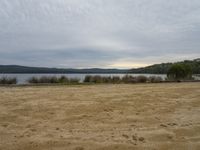 A gloomy day on the Sapphire Coast of Australia. The grey skies hang low over the highland landscape, casting a gloomy atmosphere on the open grassy plains and sandy coastal banks. A dirt track leads to Wallagoot Lake, offering a peaceful retreat into nature.
