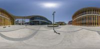 Saragossa's modern urban design is showcased in this colorful cityscape. The business district features multicolored office buildings with concrete surfaces. Clear skies cast hard shadows on the asphalt roads and metal walls. A vibrant day in Zaragoza, Spain.
