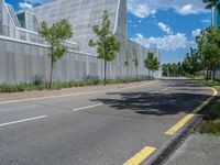 A modern architecture in Saragossa, Spain. The metal wall casts a hard shadow on the asphalt road. Clear skies and clouds create a dramatic backdrop. A perfect representation of urban architecture in Europe.