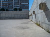 A modern urban plaza in Saragossa, Spain. The concrete walls and open spaces create a sleek and sophisticated architectural design. The clouds in the clear blue sky add a touch of serenity to the European cityscape.