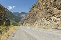 A scenic asphalt road winding through the mountainous landscape of British Columbia, Canada. The road surface contrasts with the lush vegetation and towering rock walls. Clear skies and a gentle slope add to the natural beauty of Lillooet.