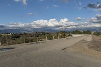 A scenic landscape with a winding asphalt road surrounded by nature. The road leads up a hill in a rural area. Puffy cumulus clouds fill the sky. The road provides entry and exit to the highway through inclined ramps.