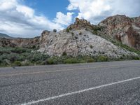 A scenic view of an asphalt road winding through the beautiful landscape of Utah. Majestic mountains loom in the background, while fluffy clouds dot the clear blue sky. A perfect day for a drive in the USA.