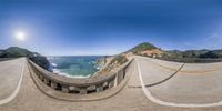 a 360 - view lens of a scenic ocean view with a bridge, and some cliffs