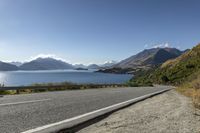 This stunning image captures a coastal road winding its way along the shoreline with breathtaking views of the majestic ocean. The smooth asphalt road curves through a beautiful landscape with mountains in the background and is surrounded by lush vegetation. The clear blue sky and fluffy white clouds reflect in the calm waters of a nearby lake. It is a perfect day for a drive and to immerse oneself in the beauty of nature and the highland scenery. This photo showcases the seamless blend of road and nature, offering a sense of tranquility and serenity.