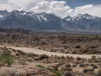 A dirt road winds through Alabama Hills, California, under a clear sky. The landscape boasts rugged mountains and gravel tracks, embodying the off-road allure of this USA desert location.