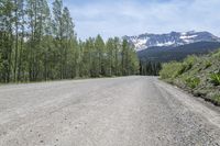 This stunning stock photo captures a long dirt road winding through the picturesque Colorado highlands. In the distance, majestic mountains rise against the clear blue sky, creating a breathtaking backdrop. Trees and grass in the foreground add a touch of natural beauty to the landscape. The road, with its low asphalt surface, invites adventure seekers to explore the off-road track and immerse themselves in the wilderness. This image perfectly represents the untamed beauty and ruggedness of the Colorado landscape, making it an ideal choice for nature and travel-related projects.