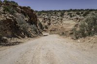 This stunning stock photo captures a dirt road winding through the picturesque landscape of Utah. The road leads towards the beautiful red rock hills, with a steep cliff area covered in rocks in the background. The clear sky above highlights the natural beauty of the area. This off-road track is surrounded by sandy desert, with patches of grass and vegetation along the road. The rugged terrain and mountain landforms create a breathtaking backdrop. This image perfectly depicts the captivating scenery of Utah's canyonlands, particularly in the Moab area. It's an ideal representation of the unique beauty and ruggedness of the American West.