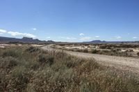 A scenic drive through the Bardenas Reales in Navarre, Spain. The low, desert landscape features a winding dirt road surrounded by rugged mountains. The grassy plains contrast with the arid, wilderness environment.
