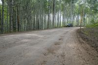 A picturesque dirt road surrounded by towering trees, with a car gracefully traversing the landscape of Kebler Pass in Crested Butte, Colorado. The road surface displays a mixture of sand, dirt, and gravel, creating a rustic and natural atmosphere. The vibrant green grass and lush forest vegetation enhance the beauty of the alpine surroundings. The majestic mountains in the distance complete the breathtaking landscape. This image captures the essence of a peaceful day drive through the scenic beauty of Colorado's woodlands.