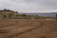 a small dirt path going through the desert with mountains in the background on a grey cloudy day