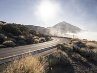 This stunning stock photo captures a bendy highway in Spain, surrounded by breathtaking mist-covered mountains. The asphalt road winds its way through a picturesque landscape, with trees dotting the highlands and hills. The majestic mountain landforms create a mesmerizing backdrop. Taken during the day, this image showcases the beauty of nature and the wildness of the Spanish countryside. The curve of the road and the high elevation give a sense of adventure and exploration. The infrastructure of the highway, including the Armco barrier, adds a touch of modernity to the wilderness. The clear sky and abundant sunshine make it a perfect day for a drive. With Europe's Tenerife island in the background and the sun visible above the clouds, this photo truly captures the essence of a sunny day in Spain.