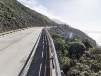 This is an image of a coastal road in California, USA. The road winds along the coastline, with the ocean visible on one side and mountains on the other. The asphalt road surface is lined with trees, while clear skies and sunshine illuminate the landscape. In the distance, a bridge connects the two sides of the highway. This photo captures the beauty of nature and the infrastructure that allows for transportation along the Pacific Coast Highway in Big Sur, California.