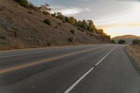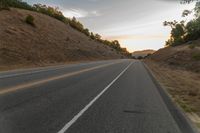 This stunning stock photo captures the beauty of nature as a highway stretches off a hill to the horizon at sunset. A lone cyclist can be seen biking along the asphalt road, surrounded by hills, mountains, and lush green grass. The landscape is adorned with trees and vegetation, adding to the picturesque scenery. The clouds in the sky create a serene ambiance, making this image perfect for any project related to nature, rural settings, or outdoor activities. The road surface, lined with tar, seamlessly blends with the surrounding terrain, showcasing the seamless integration of infrastructure and the natural environment. The sloping hills and mountain landforms in the distance add depth and visual interest to the composition. This captivating stock photo beautifully captures the tranquil beauty of nature at dawn, making it an ideal choice for various design projects.