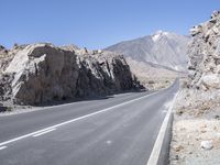 A scenic road in Tenerife, Spain, winding through rugged landscapes and mountain ranges. The asphalt highway cuts through the rocky terrain, offering breathtaking views of the clear sky above. Experience the natural beauty of Europe.